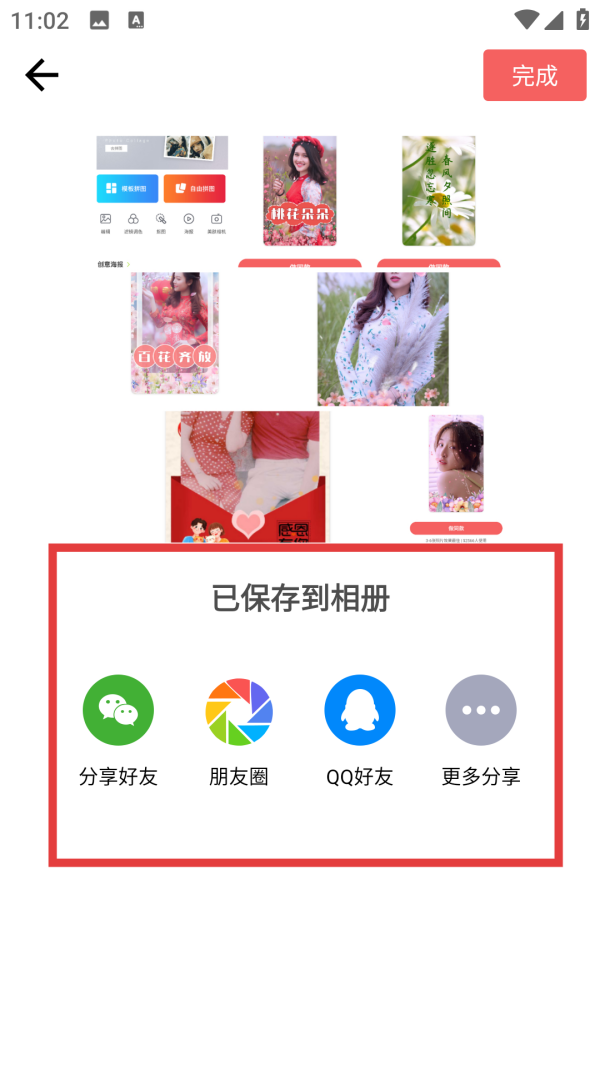 3、保存后彈出已保存到相冊提示,除存相冊還能點分享好友、朋友圈等,把拼圖分享到社交平臺,也可通過更多分享選其他渠道,方便將作品分享給他人。