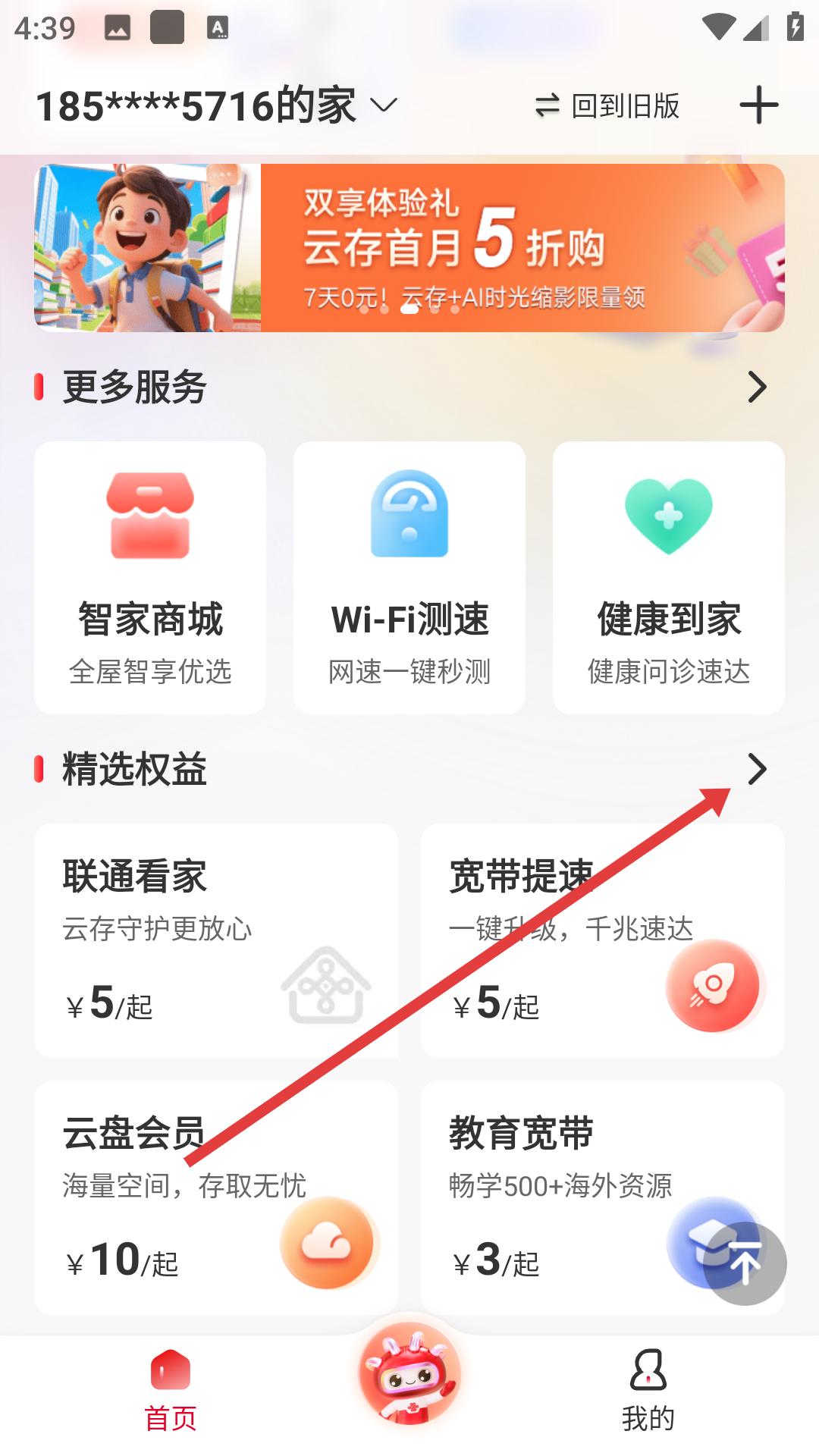 1、進入聯通智家APP,在精選權益板塊點擊右側箭頭,可查看更多權益選項,包括聯通看家、寬帶提速等服務。
