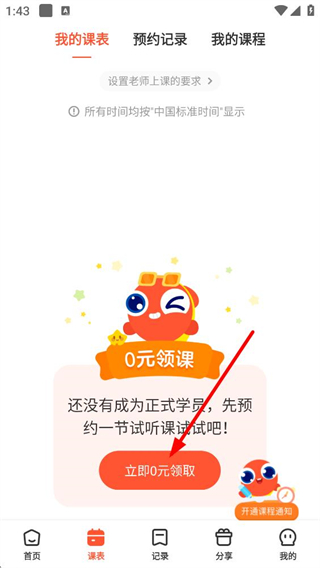 2、點擊課表選項可進入我的課表頁面,若未成為正式學員可點擊立即0元領取預約試聽課,還能設置老師上課要求,管理課程安排。