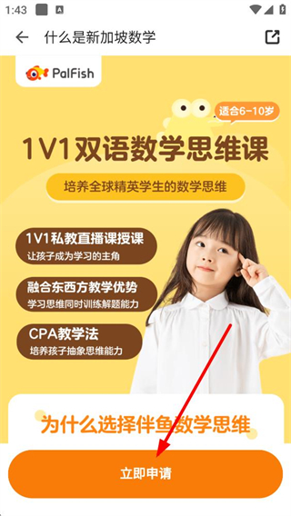 3、查看新加坡數學介紹頁面,可了解其1V1雙語教學CPA教學法等特色,點擊立即申請即可參與對應課程的報名,助力孩子數學思維提升。