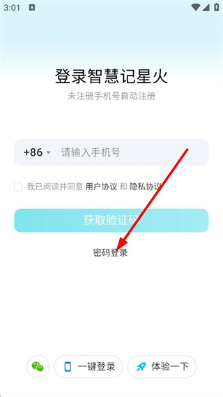 1、進入智慧記星火的登錄頁,可對應輸入框填寫手機號,勾選相關協議后選擇驗證碼登錄,也能點擊密碼登錄選項切換登錄方式。