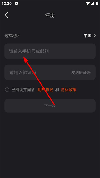 4、進入注冊界面,有選擇地區、手機號、郵箱、驗證碼的輸入項,還有發送驗證碼按鈕,后續可填寫信息推進注冊流程。