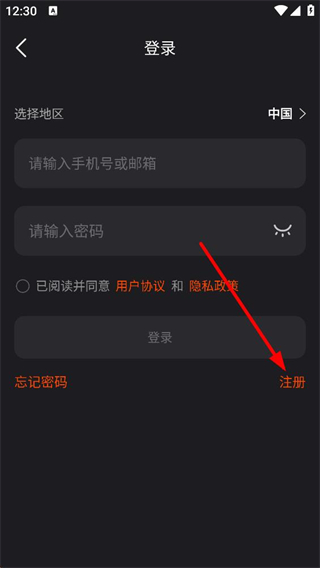 3、進入登錄界面,顯示選擇地區、手機號、郵箱及密碼的輸入項,點擊注冊選項,切換至注冊賬號的操作界面。