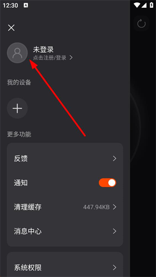 2、打開功能側邊欄后,看到未登錄提示,還有我的設備、更多功能等板塊,點擊未登錄區域,進入登錄操作界面。