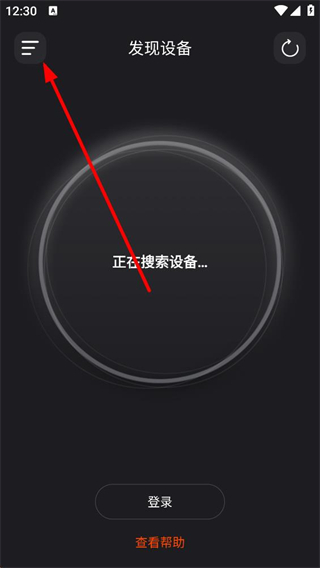 1、進入發現設備界面,可見正在搜索設備的提示,左上角有菜單按鈕,點擊該按鈕,打開包含多項功能的側邊欄界面。