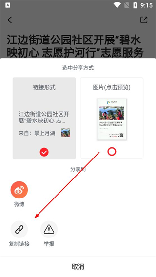 4、在分享方式界面選擇鏈接形式或圖片形式,再選定想要分享的平臺,點擊對應選項,完成該資訊內容的分享。