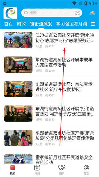 2、登錄成功后進入首頁切換到街道風采板塊,瀏覽展示的志愿活動等資訊,選擇感興趣的條目,點擊進入該資訊的詳情頁面。