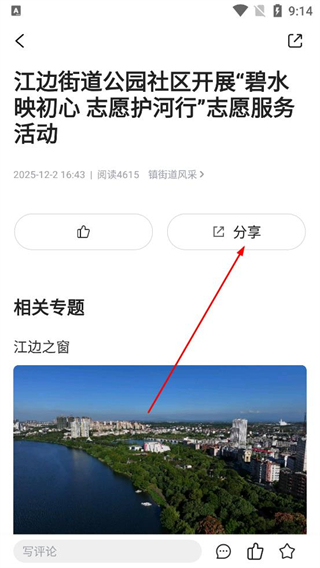 3、在資訊詳情頁查看活動的具體內容及閱讀量,找到分享按鈕,點擊該按鈕,彈出分享方式選擇界面,準備選擇分享渠道。