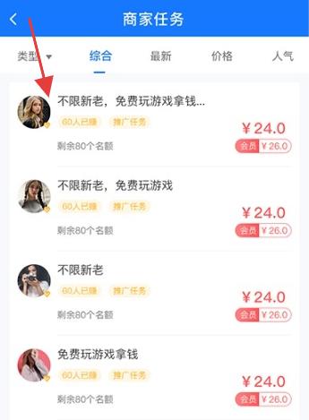 3、進入商家任務頁,看推廣任務,選免費玩游戲,按要求參與,完成任務拿收益。
