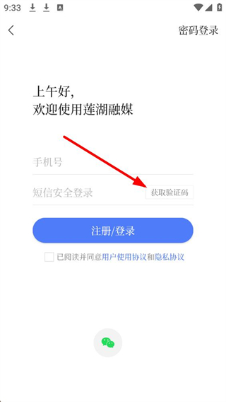 3、進入登錄界面,可輸入手機號、獲取驗證碼后點擊注冊、登錄,也可選擇微信登錄方式,登錄前需勾選已閱讀并同意用戶使用協議和隱私協議。