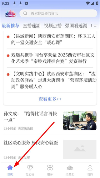 1、打開蓮湖融媒APP,進入首頁,可看到最新推薦、直播蓮湖等欄目,展示多條本地新聞資訊,點擊底部我的按鈕進入個人界面。