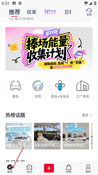 1、點擊發現頁,有推薦等欄目,展示暑期煥新季活動,提供看車、試駕等服務,還有熱榜話題。