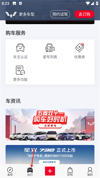 2、出行頁聚焦購車服務,含車主認證、愛車列表功能,同步車資訊與車型信息,是購車相關服務的管理頁面。