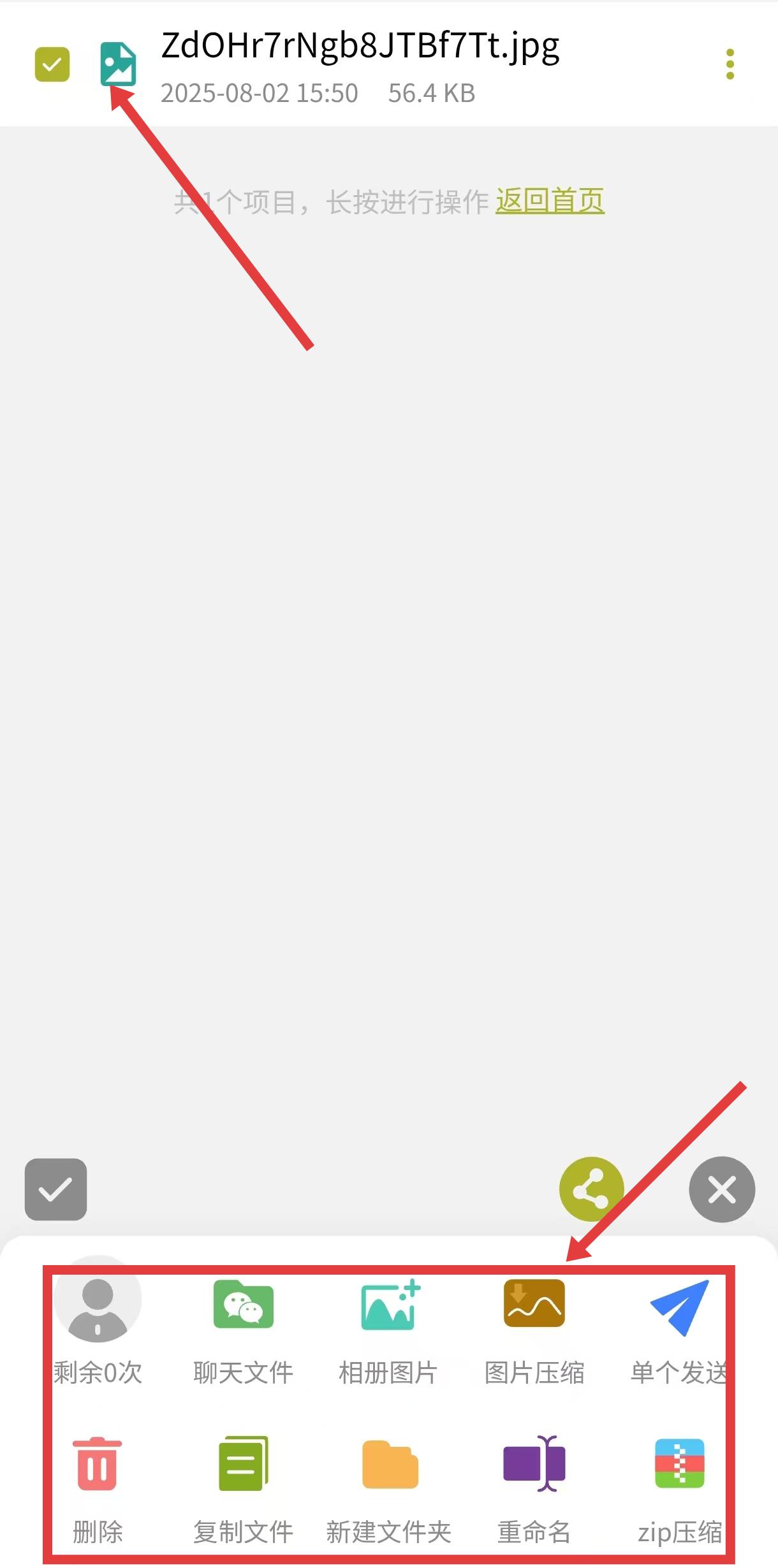 3、選中圖片文件后底部彈出功能欄,含聊天文件、圖片壓縮等選項,還有刪除、復制等操作,助力用戶處理文件。
