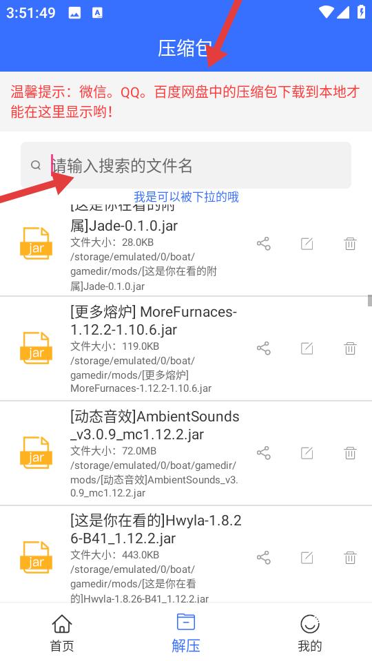 2、解壓頁面頂部設搜索欄提示輸入文件名,下方列本地壓縮包,如Jade相關jar文件,顯示大小和路徑,方便用戶查找解壓文件。