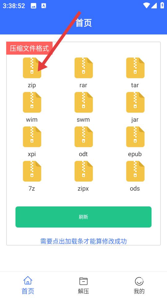 1、首頁陳列多種壓縮文件格式圖標,zip格式位于左上角,還有rar、tar等下方刷新按鈕醒目,提示點加載條完成修改,方便用戶識別壓縮格式。