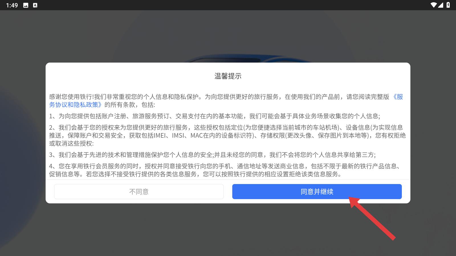 1、開啟鐵行App,待溫馨提示界面彈出,認真審閱其中提及的服務協議內容,點擊界面右下角的同意并繼續按鈕,進入應用。