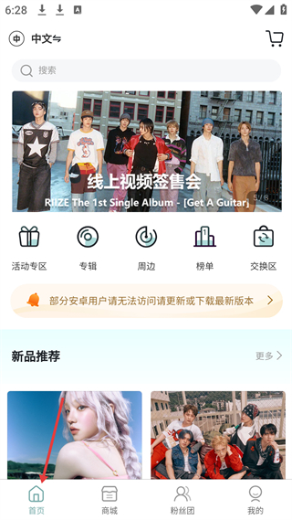 1、首頁有搜索欄,展示RIIZE線上視頻簽售會,有活動專區、專輯等功能入口,還有新品推薦板塊,提供多元追星服務。