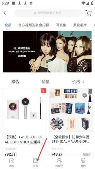 2、商城,可搜索商品,有官方視頻簽名會招募等分類,展示aespa簽售會及TWICE應援棒等商品,可按銷量、價格篩選。