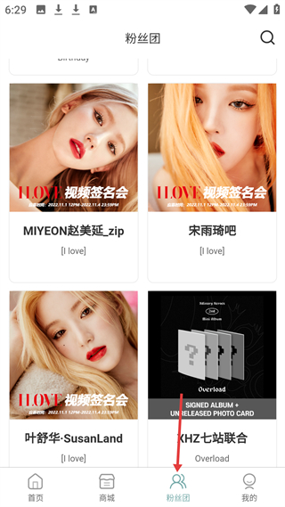 3、粉絲團,展示趙美延、宋雨琦等藝人視頻簽名會招募,還有KHZ七站聯合專輯活動,供粉絲參與偶像相關活動。