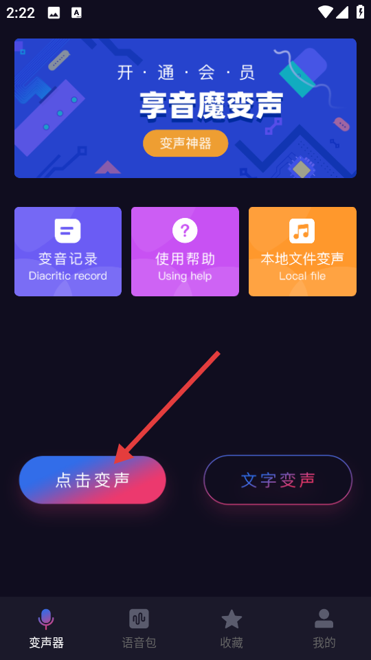 1、APP主界面布局清晰,上方有變音記錄、使用幫助、本地文件變聲等功能入口,以實時變聲為例子,點擊醒目的點擊變聲按鈕,即可開啟實時變聲功能。