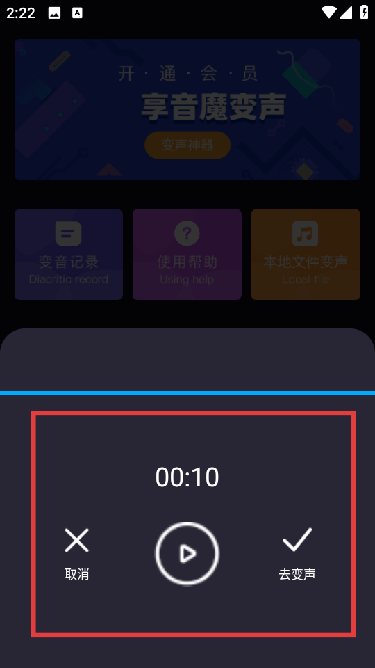 2、點擊點擊變聲后進入錄音界面,若不想繼續錄音點擊取消按鈕,若想試聽錄音效果點擊播放按鈕,若確認錄音并進行變聲,點擊去變聲按鈕進入變聲設置環節。