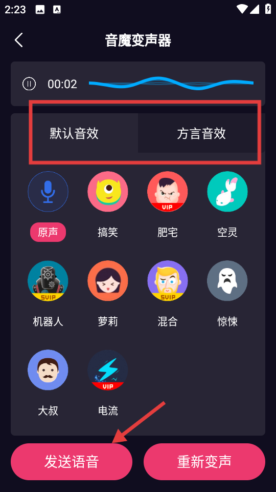 3、音魔變聲器設置界面有默認音效和方言音效兩種音效類別可供選擇,下方排列著多種變聲效果,選擇好喜歡的變聲效果后,點擊發送語音按鈕就能將語音分享出去。