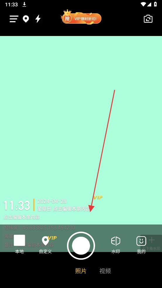 1、搞定相機水印APP拍攝頁、時間等默認水印信息,點擊點擊編輯本條內容可自定義水印文字,搭配VIP標識,滿足工作場景水印需求。