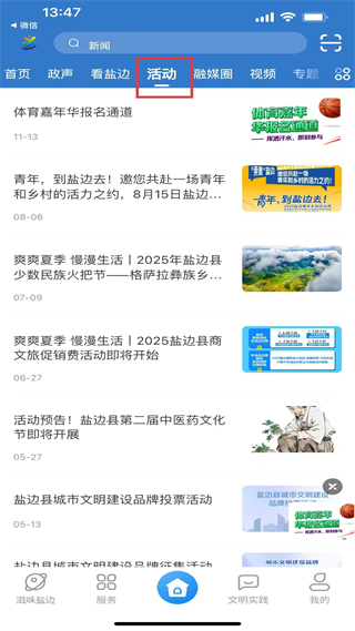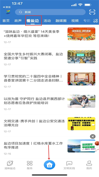 1、進入看鹽邊板塊,可瀏覽美食季、鄉村振興大賽等各類資訊,獲取鹽邊當地的活動、會議信息,開啟資訊瀏覽體驗。