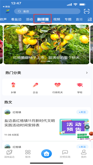 2、切換到融媒圈板塊,能查看紅格脆甜柿子內容,瀏覽熱門分類與熱文,了解鹽邊不同主體發布的信息,參與互動。