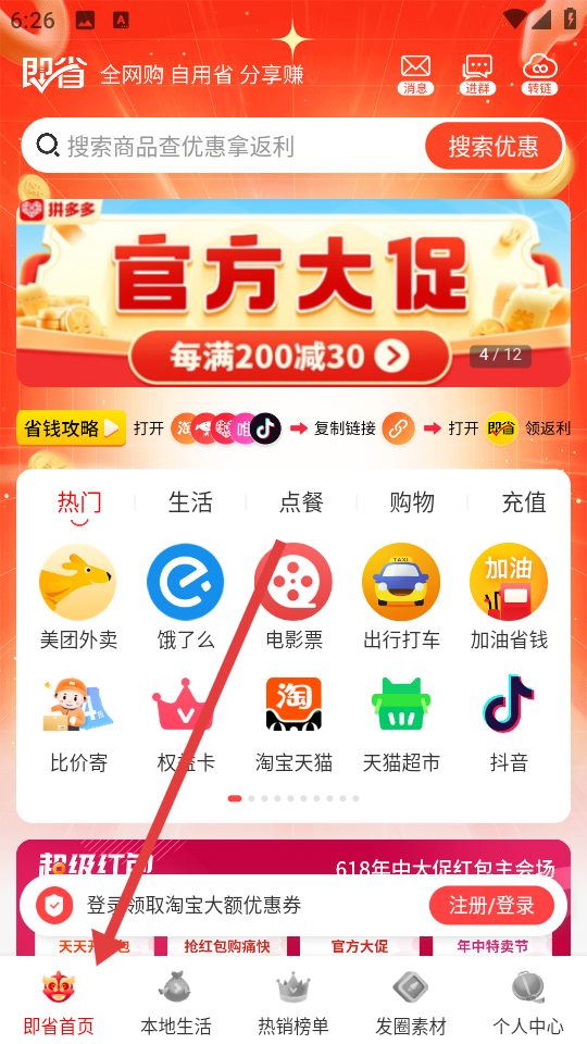 2、進入首先看到的是即省首頁,這里有搜索欄可查找商品優惠,輪播圖展示官方大促活動,下方熱門等分類板塊可按需點擊進入。