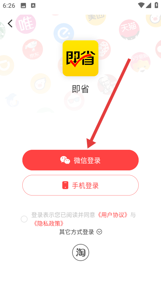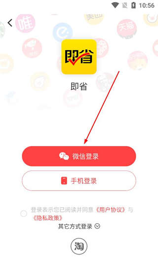 1、打開即省APP,進入登錄頁面選擇微信登錄或手機登錄,勾選登錄表示已閱讀并同意用戶協議與隱私政策,完成賬號登錄。