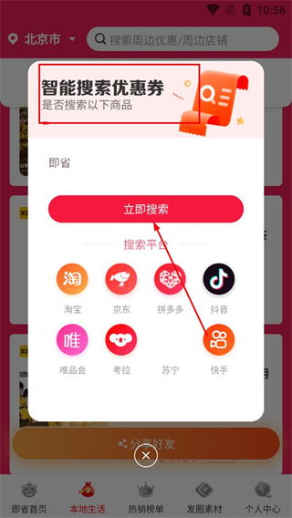 2、登錄后彈出智能搜索優惠券提示,點擊立即搜索,可選擇淘寶、京東等平臺進行優惠搜索。