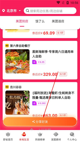 3、進入本地生活頁面可看到美團到店、餓了么等板塊,還有各類優惠團購信息,瀏覽本地生活優惠內容。