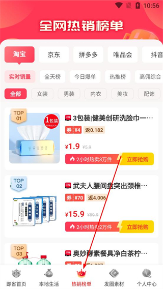 4、進入熱銷榜單頁面可看到淘寶、京東等平臺的全網熱銷榜單,選擇感興趣的商品,如健美創研洗臉巾,點擊立即搶購,進行商品購買。