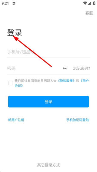 1、打開APP后進入登錄界面,可選擇輸入手機號、超星號和密碼登錄,也可點擊新用戶注冊或手機驗證碼登錄,還需勾選同意隱私政策和用戶協議。