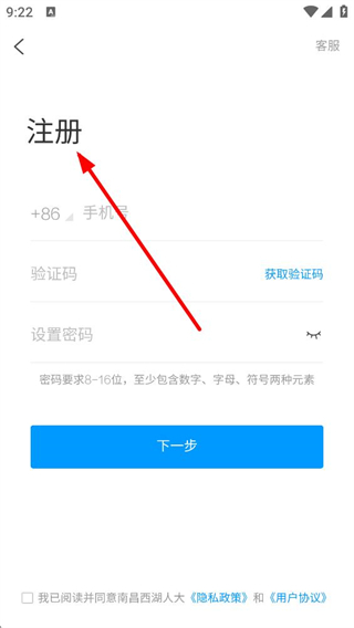 3、新用戶注冊時,輸入手機號,獲取并輸入驗證碼,設置符合要求的密碼,點擊下一步,且要勾選同意隱私政策和用戶協議。