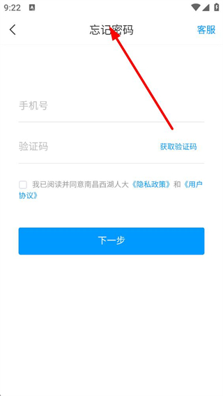4、若忘記密碼,輸入手機號,獲取并輸入驗證碼,勾選同意相關協議后點擊下一步,即可進行密碼重置操作。