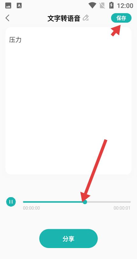 3、文字轉語音結果頁進度條顯示播放進程,暫停鍵便捷,右上角保存按鈕方便留存,底部分享功能,助力用戶處理轉換后的語音。
