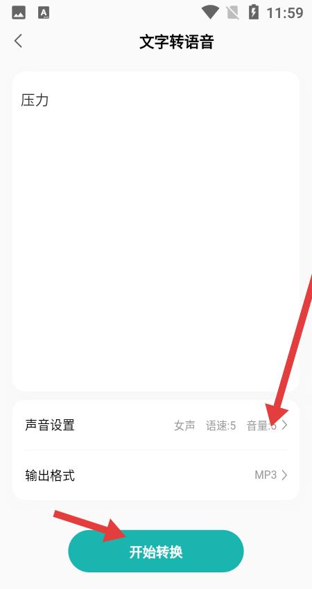 2、文字轉語音界面輸入框可填文本,聲音設置支持調整女聲、語速與音量,下方開始轉換按鈕,用戶錄入內容、設定參數后,點擊即可將文字轉化為語音。
