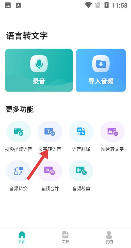 1、首頁劃分語言轉文字與更多功能板塊錄音和導入音頻按鈕突出,更多功能區里文字轉語音圖標清晰,布局簡潔,幫助用戶快速定位該功能。