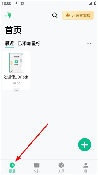 1、進入迅讀PDF首頁,可看到最近查看的PDF文件,頂部有搜索和升級專業版按鈕,底部有最近、文件、工具、我等功能欄,方便用戶管理和查看PDF文件。