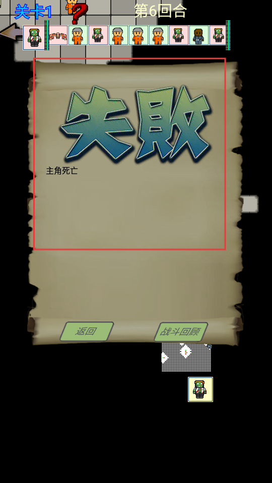 4、若戰斗失敗,會顯示失敗,主角死亡,可選擇返回主界面或進行戰斗回顧,總結經驗,重新開始挑戰關卡。