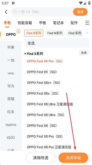 4、選擇感興趣的手機品牌和系列,如OPPOFindX系列,選擇具體的手機型號,點擊選擇等級,參與手機競拍活動。