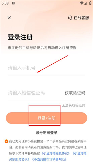 1、打開小當競拍APP,進入登錄注冊頁面輸入手機號,獲取并輸入短信驗證碼,點擊登錄注冊,完成賬號登錄。