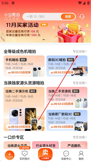 2、登錄后進入首頁可看到11月買家活動和各類競拍專區,點擊全等級成色機暗拍的專區攻略,進入攻略頁面。