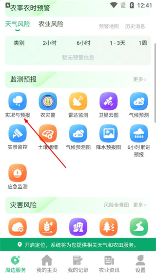 1、打開軟件進入首頁,查看天氣風險農業風險等板塊,選擇監測預報里的實況與預報功能,獲取對應的農業氣象相關監測信息。