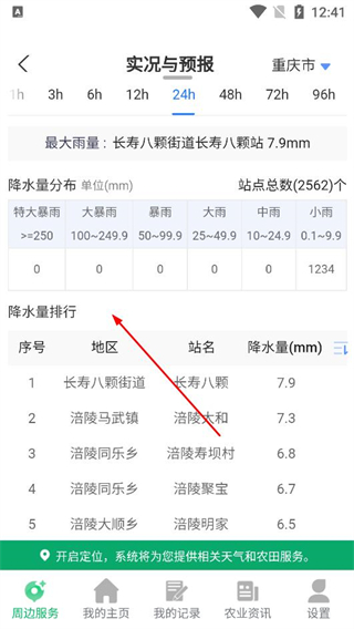 2、進入實況與預報頁面切換不同時長的預報選項,查看降水量分布及排行榜,了解不同地區的降水量數據,獲取精準的氣象信息。