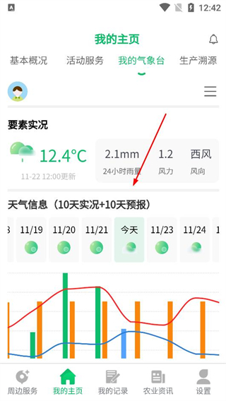 3、進入我的主頁查看要素實況里的溫度雨量等數據,瀏覽天氣信息的實況與預報圖表,了解近段時間的氣象變化趨勢。