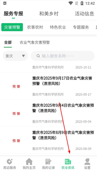 4、進入農業資訊頁面查看服務專報里的災害預警信息,瀏覽農業氣象災害預警報告,了解不同時間的災害風險提示,做好農業生產準備。